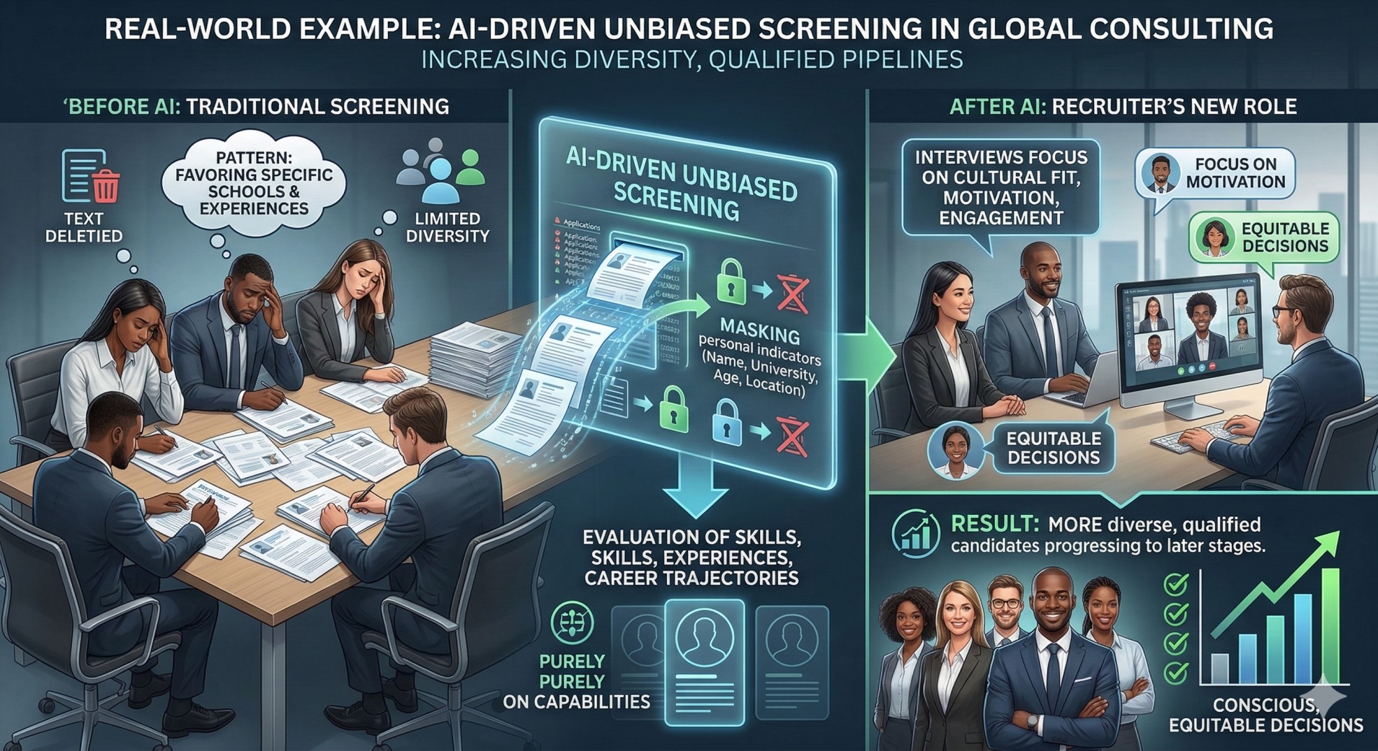 The firm introduced AI-driven screening that masked demographic and personal indicators while evaluating skills, experiences, and career trajectories. AI-generated shortlists were based purely on capabilities, allowing recruiters to focus on cultural fit, motivation, and engagement during interviews.