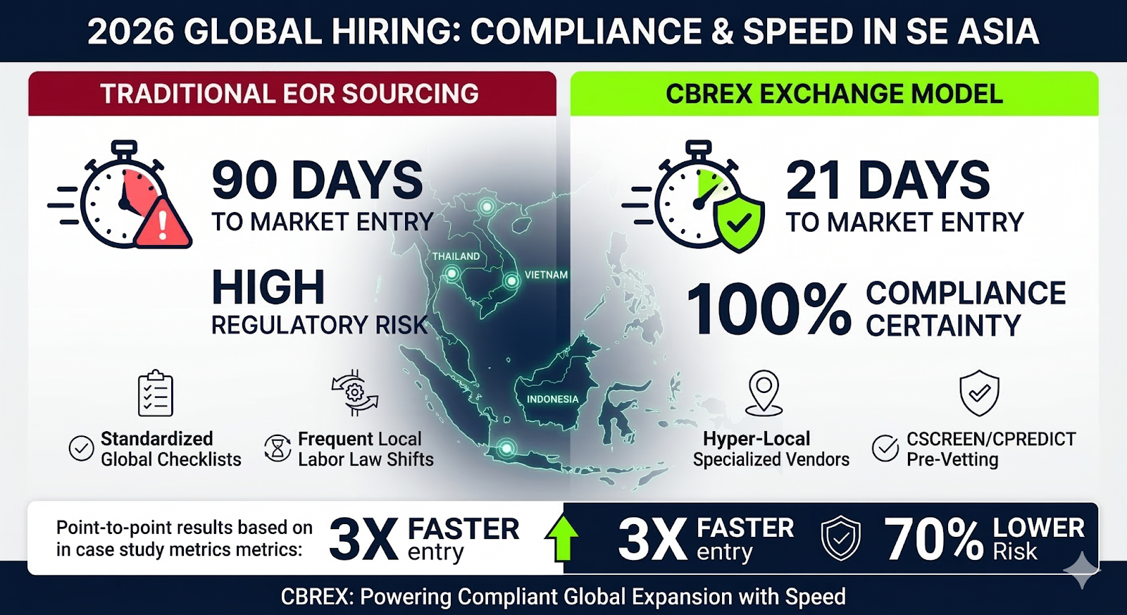 The vendor then utilizes the CSOURCE, CSCREEN, and CPREDICT stack to ensure the candidate isn't just skilled, but compliant for your specific industry. CBREX provides the global enterprise with a single point of control, while empowering the local experts who know the law best. It’s the only way to scale in 2026 without the "High-Stakes" fear.